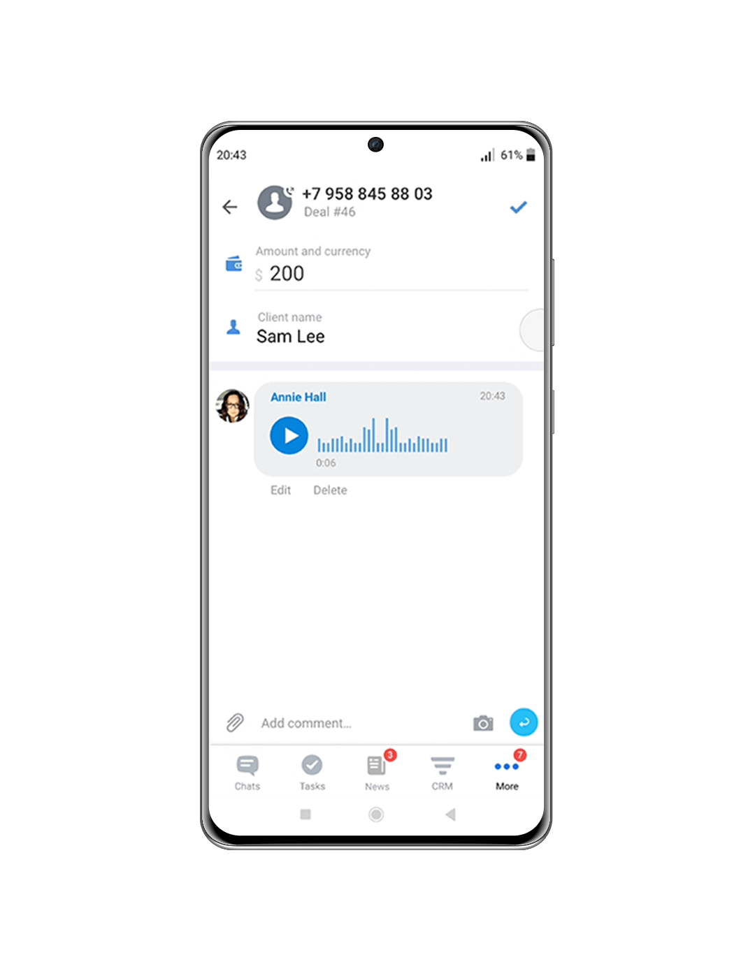 Номер клиента сохранится в CRM с пометкой «личный звонок», к нему можно прикрепить аудиокомментарий или фотокомментарий (скриншот переписки из мессенджера).
