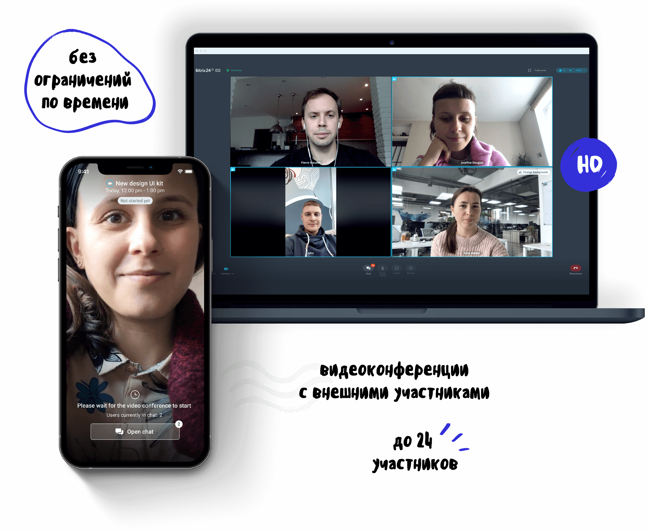 В один клик собирайте всех участников встречи, задачи или чата на групповой видеозвонок и общайтесь, где бы вы ни находились.